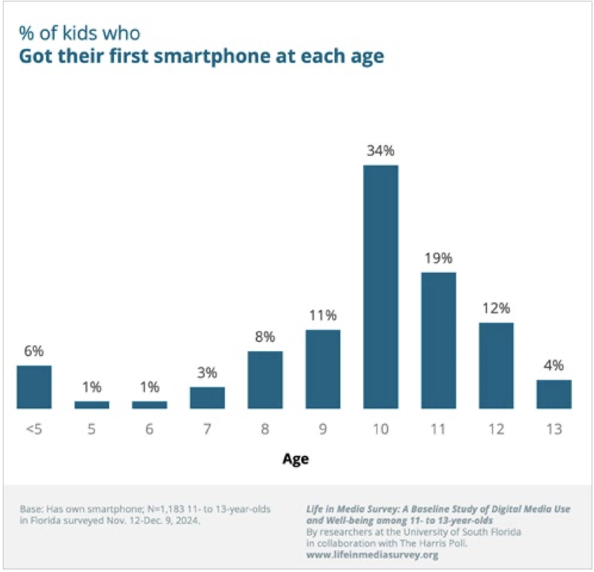 A survey by the University of South Florida asked 1,500 kids aged 11 to 13 in Florida about their smartphone use and found that over two-thirds got their first smartphone at age 10 or younger.